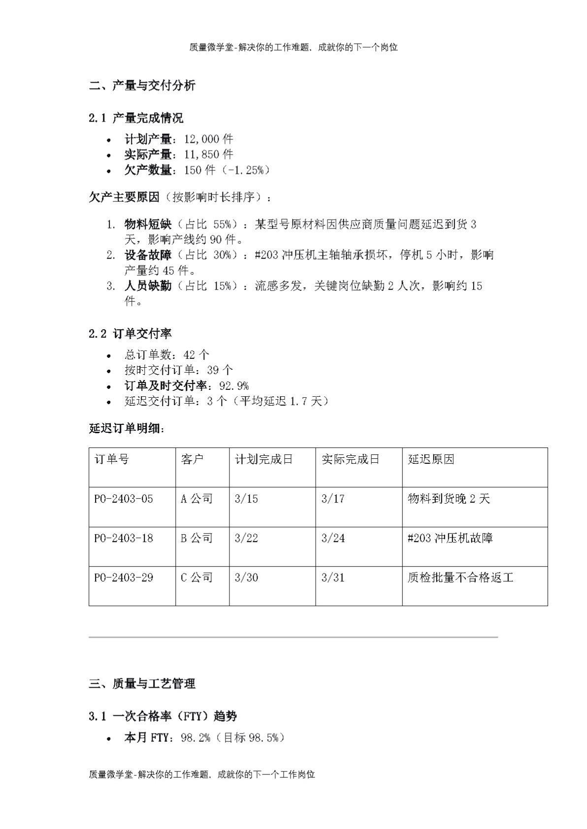 生产部月报:产量低于目标150件,FTY 98.2%,如何复盘?知识点总结 精益生产 制造知识点