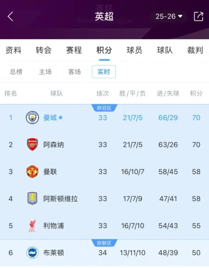 截止本场,曼城33场21胜7平5负,66球/29失,净胜37,70分。
