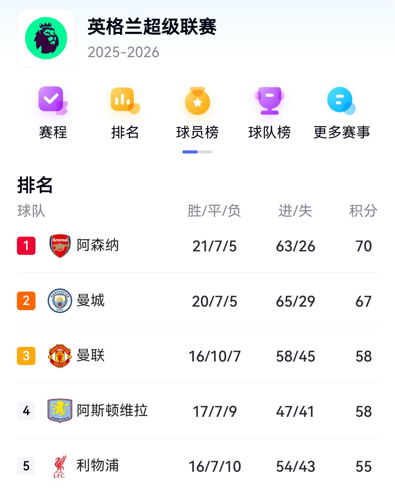 阿森纳:34场 22胜7平5负,73分