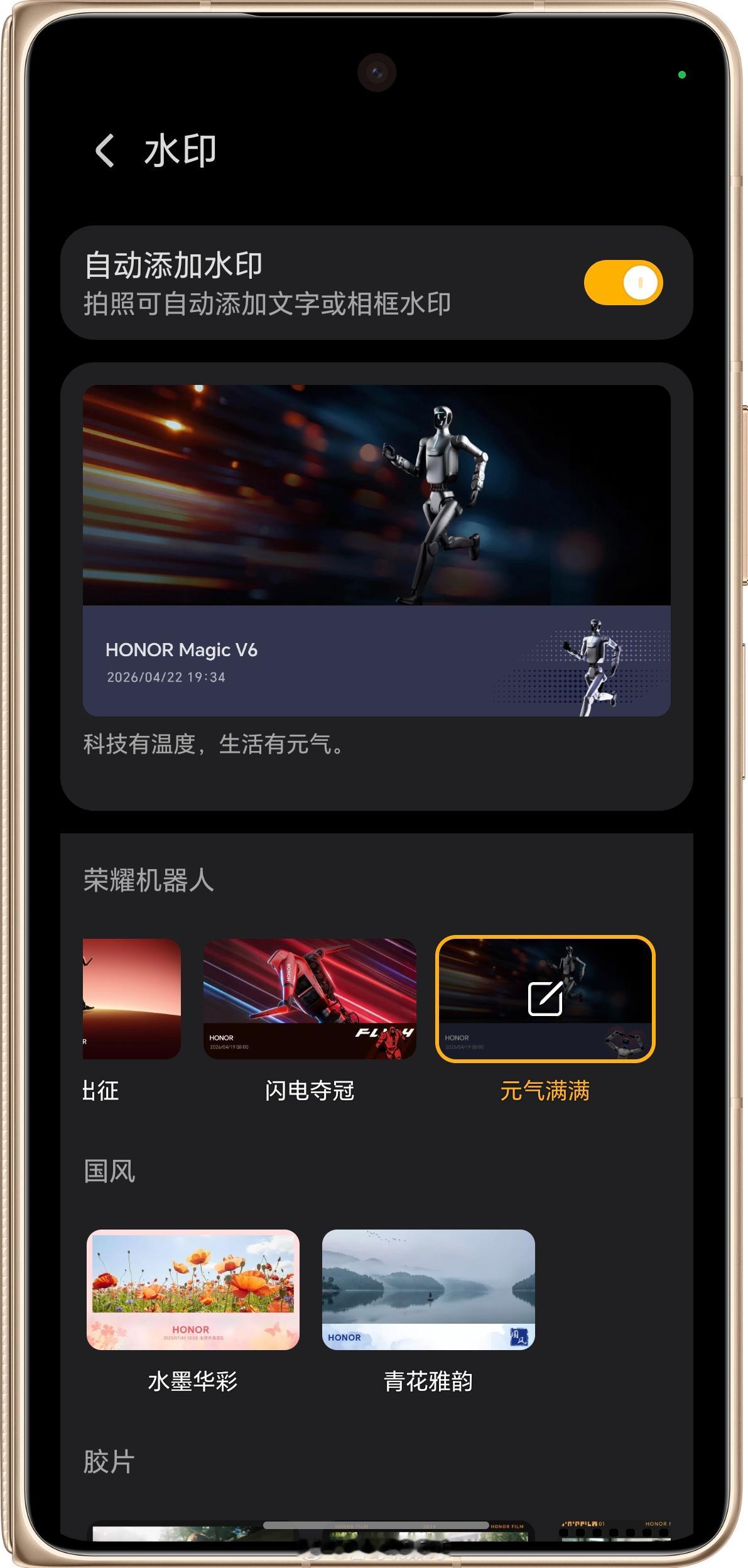 能看出来荣耀机器人 在公司的地位越来越高,应该是被作为未来重要的发展方向,系统主题和相机水印都安排上了相机水印三种样式,每种样式里面有若干动作搭配,科技感还是挺强的