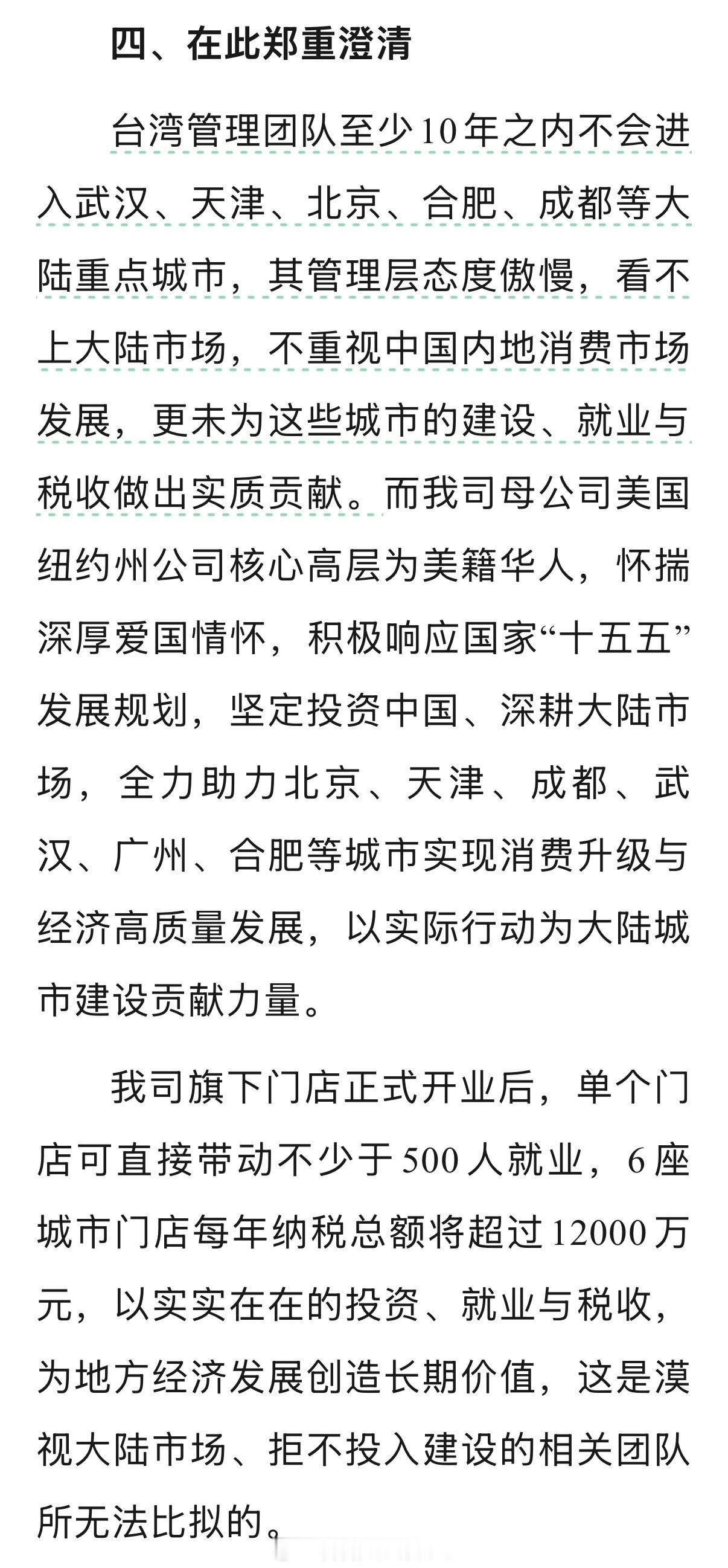 图3 现在发布入驻消息的“开市客北京国际商业发展有限公司”强调,它是美国纽约开市客的子公司,还表示,开市客现有的团队成员来自台湾,他们态度傲慢,看不上大陆市场,至少十年内不会入驻这六个城市。