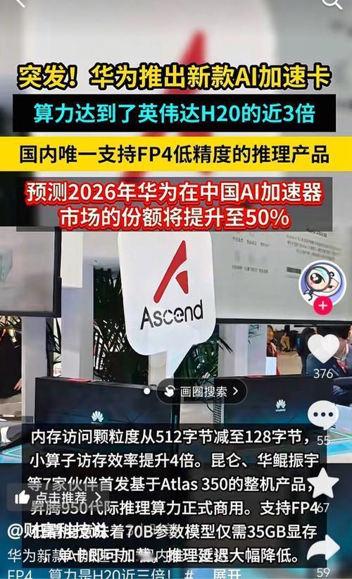咋回事?咱们国产芯片争气啊!3月底,华为昇腾950 PR的加速卡上市了。你看参数:HBM内存112GB,比H20还多,跟H200的141GB差不了多少;带宽4TB每秒,H200是4.8;算力是H20的近3倍。最关键的是,它支持FP4低精度推理,小模型上效率更高。而且单卡卖5万块,高端版7万,H200要25万!价格差这么多,性能还差不多,你说厂商选谁?