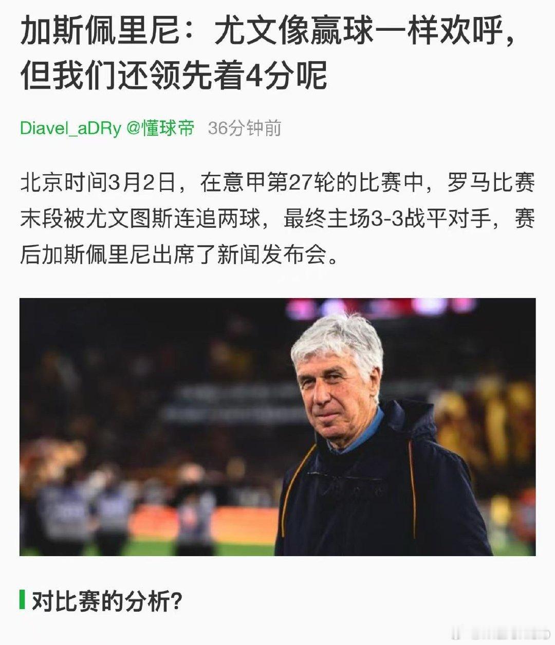 加斯佩里尼之前的那句“领先4分”的话最近被意大利媒体拉出来鞭尸了,这么看来这个赛季真的是那场绝平罗马的3比3最重要,整个球队的气势都不一样了。