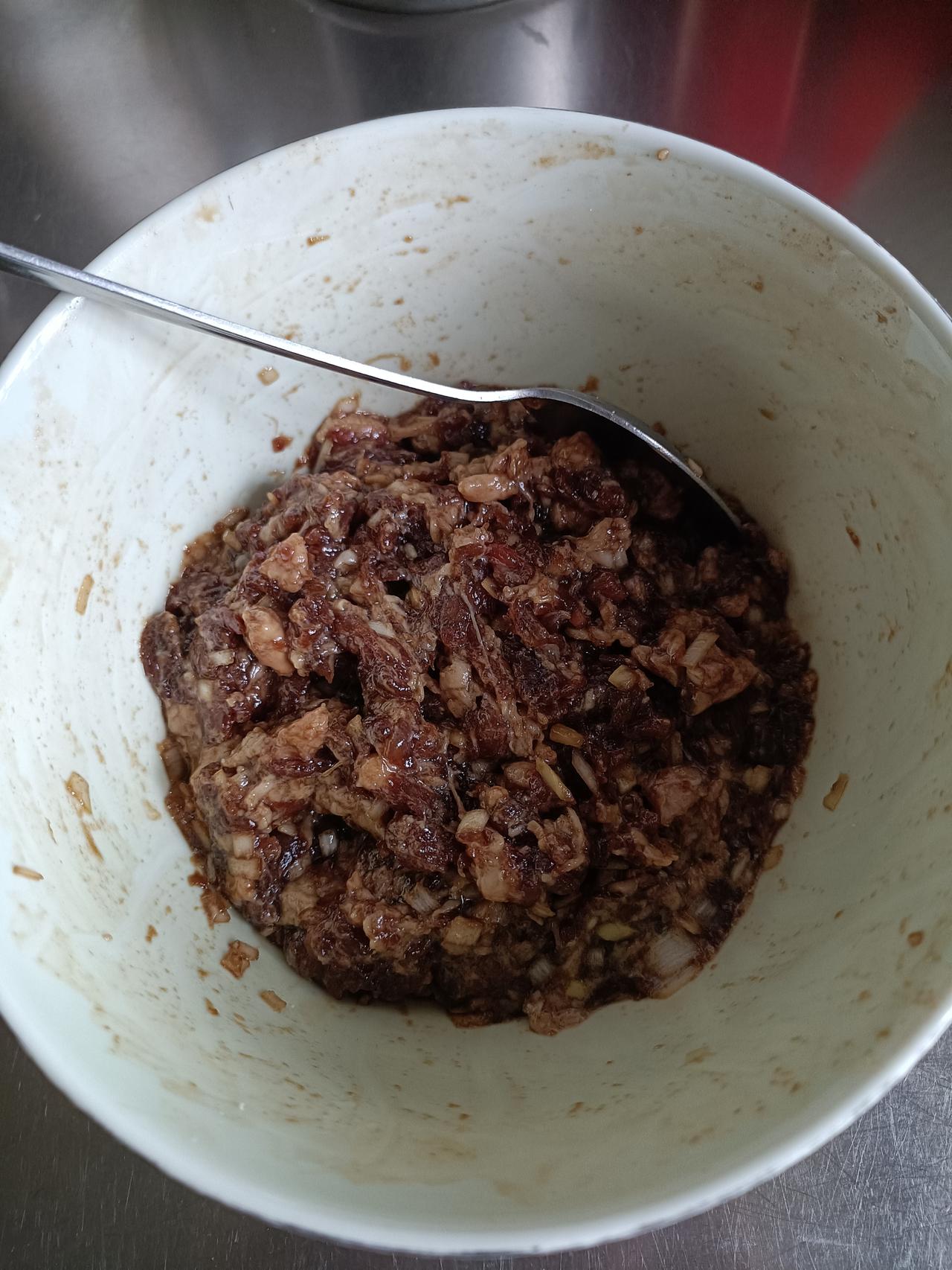 今天早饭吃馄饨,早上起来,从冰箱拿出昨天包剩下的一半馄饨皮,还有解冻好的肉馅,肉馅里加点香油,加点盐和味精,再放点葱花搅拌一下,香气扑鼻的肉馅就拌好了,十分钟就把馄饨包好了!