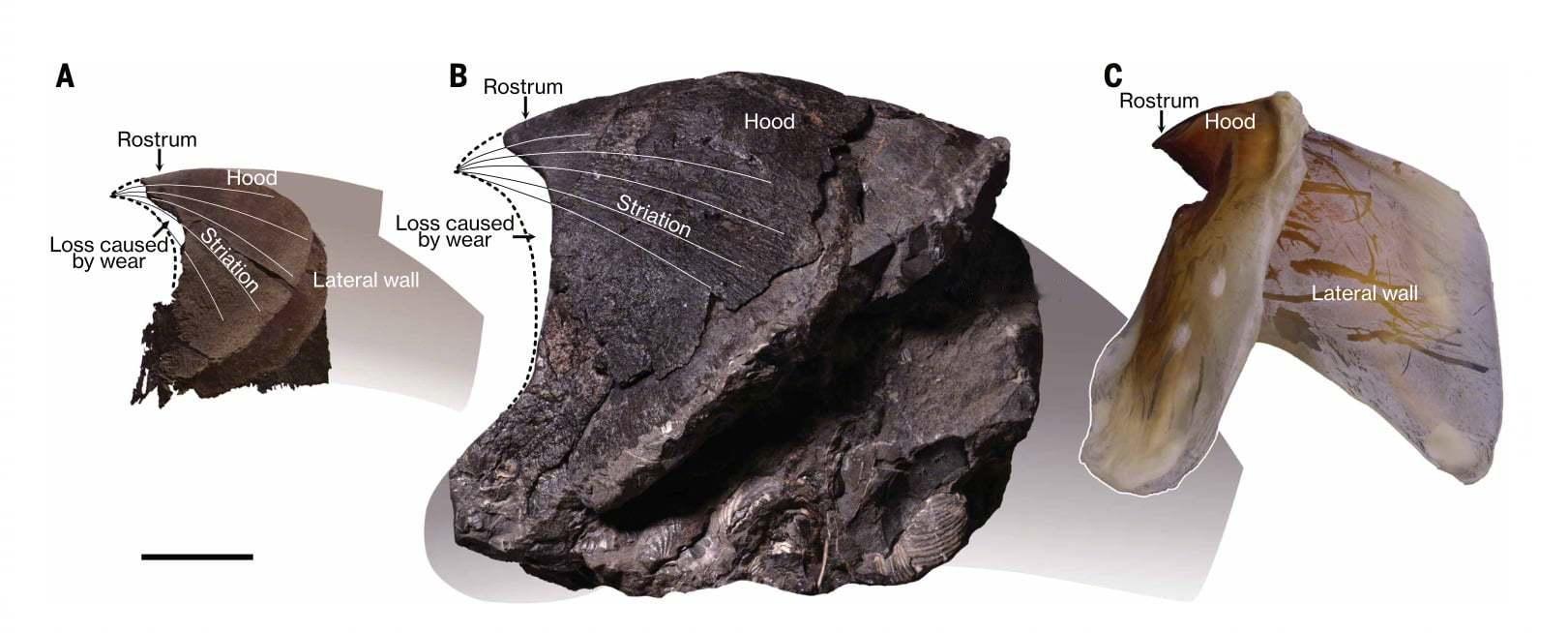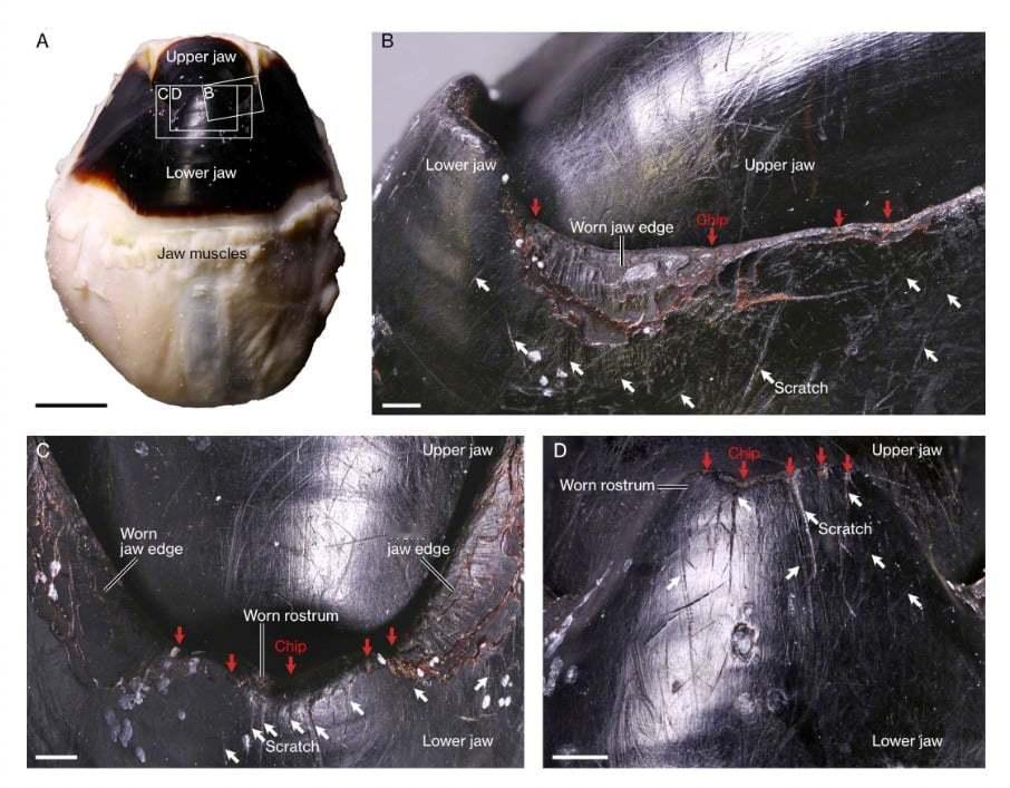 团队检查了27件来自日本和加拿大温哥华岛的大型颚化石,年代覆盖整个白垩纪,从1.45亿年前到6600万年前。排除地质侵蚀和人工采集造成的损伤后,其中15件大型颚化石上残留的磕痕、划痕和打磨光泽,跟现代章鱼和墨鱼咬碎硬壳猎物后留下的磨损高度吻合。同批化石中年幼个体和同时期鱿鱼的颚上都没有这类磨损,排除了偶然因素。