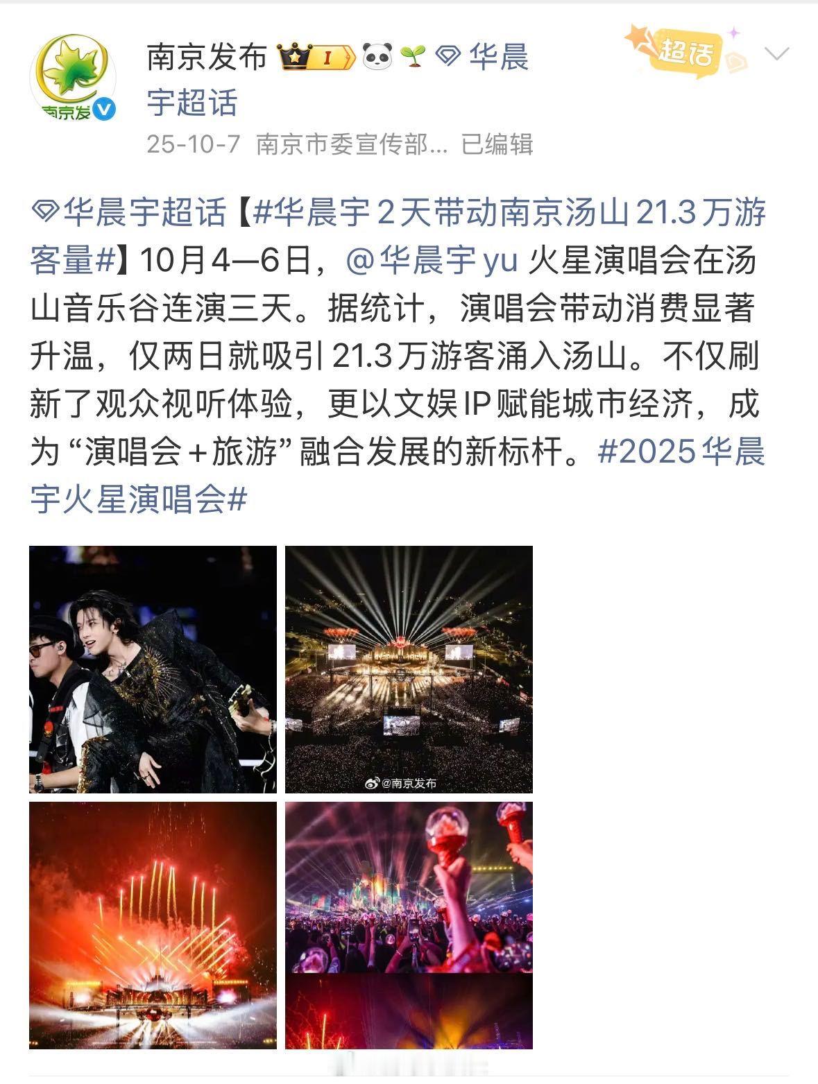 华晨宇曾2天带动南京汤山21万客流 汤山以前是个安静的小镇,华晨宇去开完演唱会之后,估计当地人都傻了:哪来这么多人?21.3万人涌入,这个小镇的接待能力应该被狠狠考验了一把。