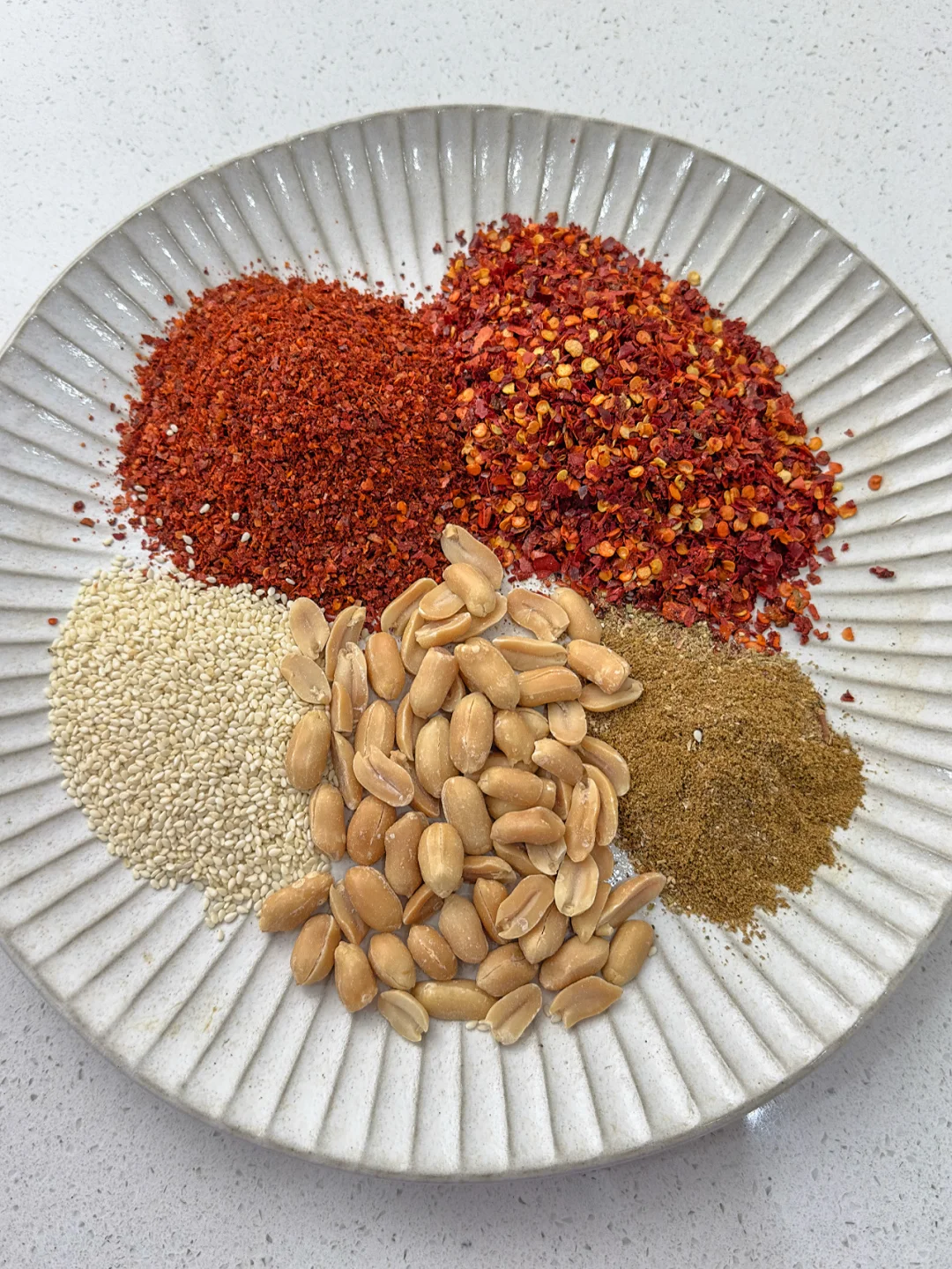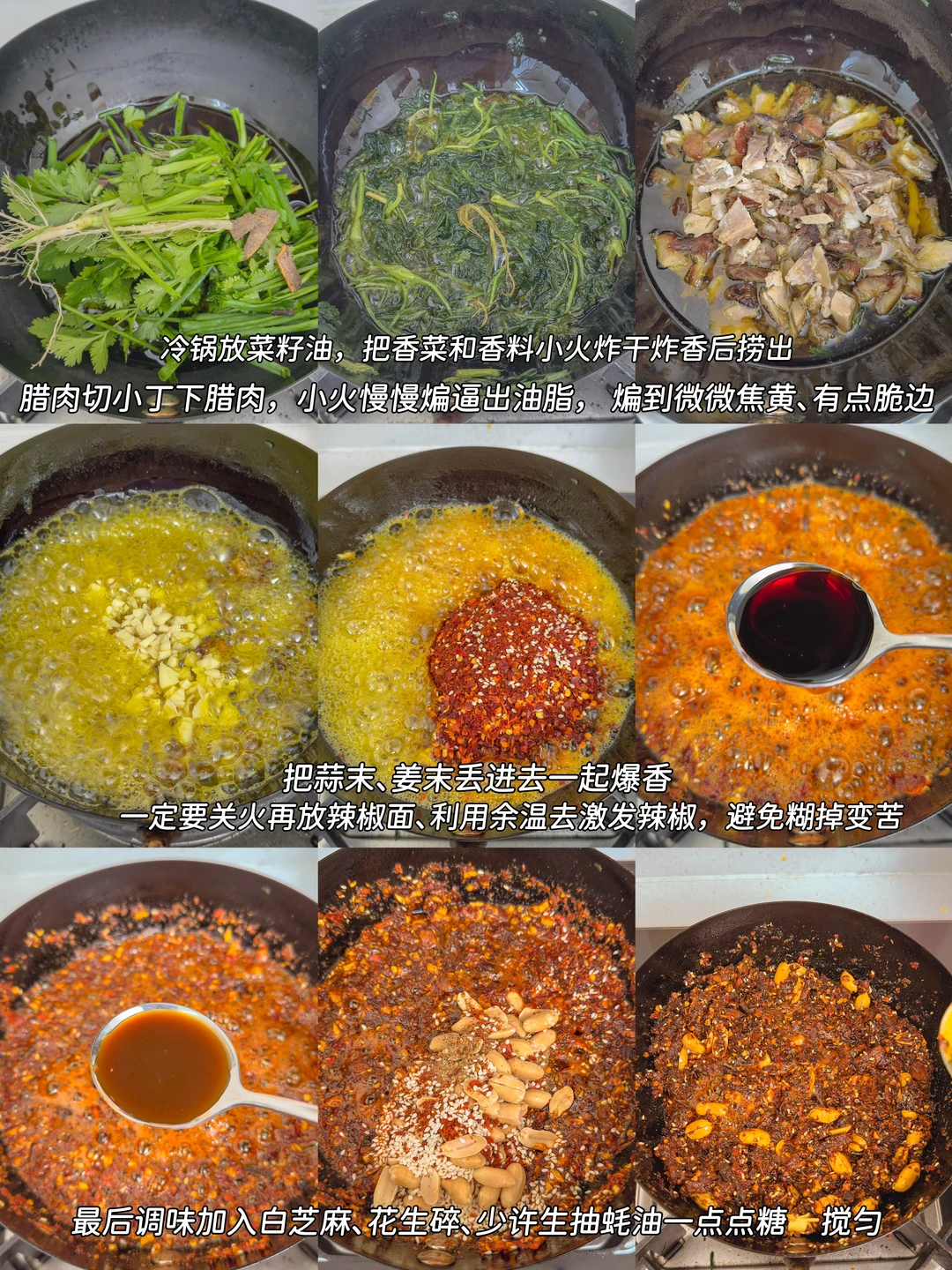 腊肉、干辣椒(粗细搭配)、白芝麻、花生、花椒面、姜末、蒜末、蚝油、白糖(一点点)、生抽、八角、桂皮、香菜、菜籽油