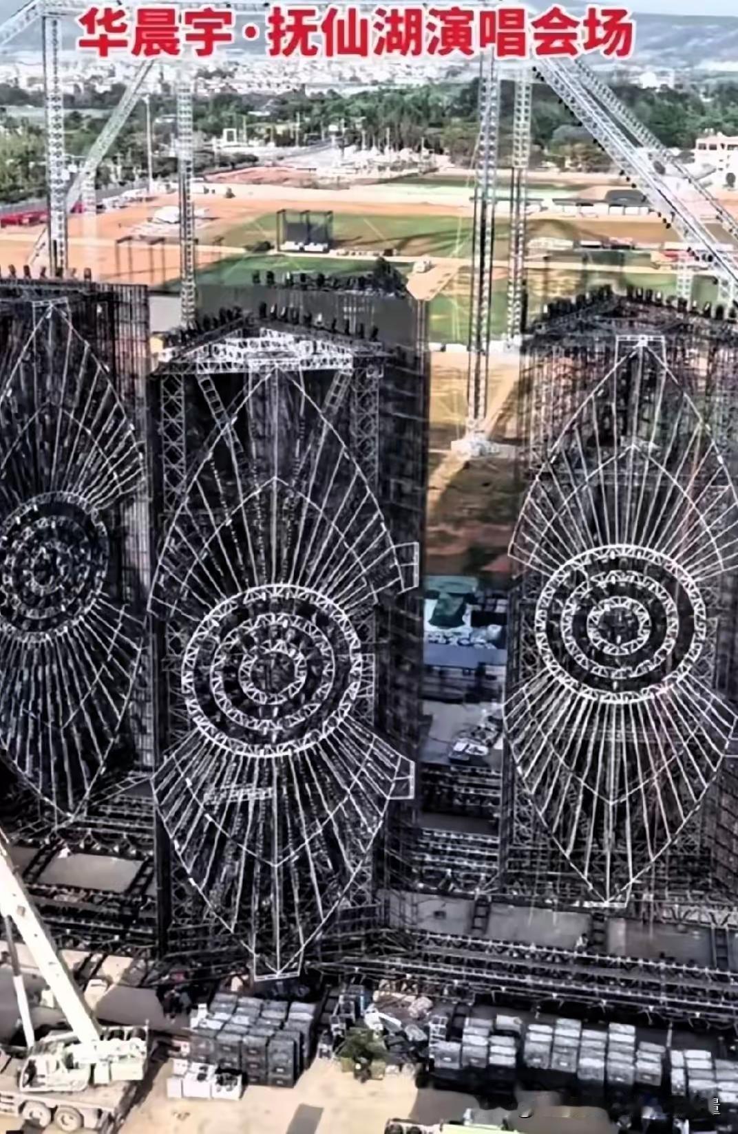 即将完工的巨型舞台造型格外怪异,整体拼接起来是硕大的独眼样式,同心圆设计搭配放射状钢架,视觉观感格外违和,很容易让人联想到小众争议符号。