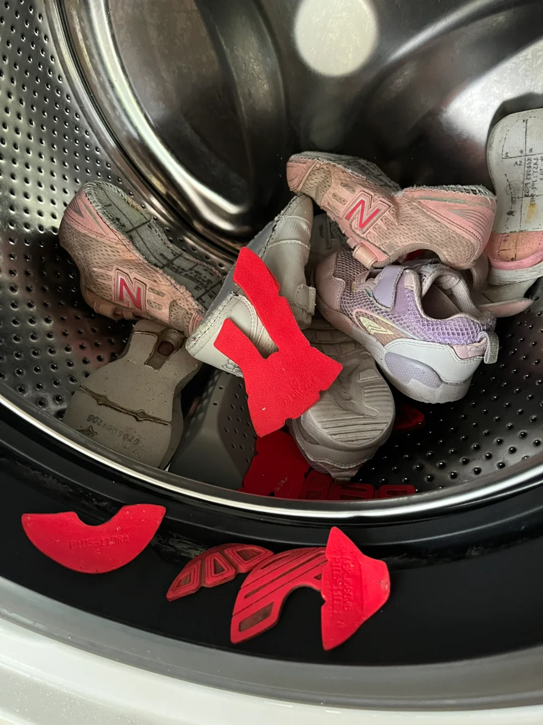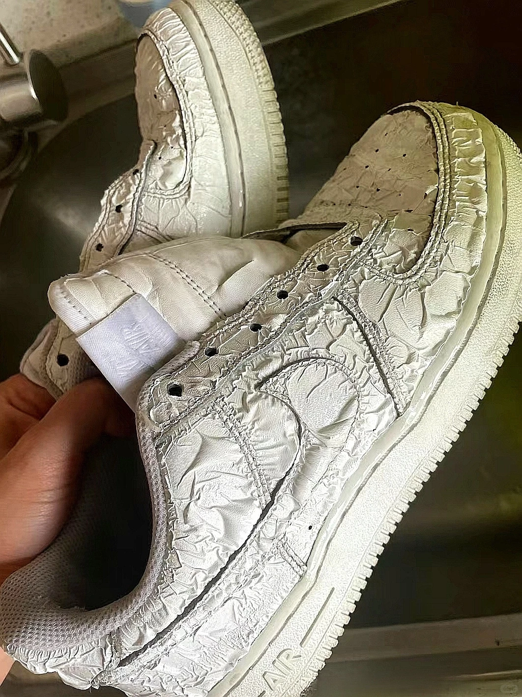 不仅如此,而且洗衣机的高速运转,很可能让你的鞋子分家,不是鞋面刮花,就是鞋底脱胶,就连鞋垫子都被甩干系统耍出来!