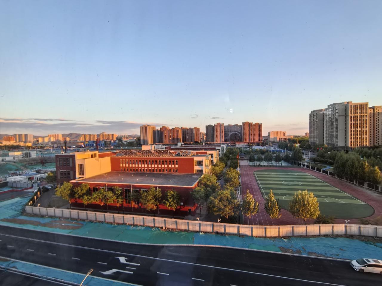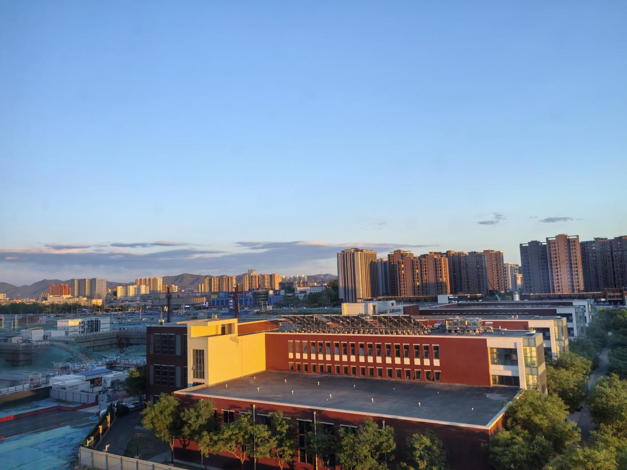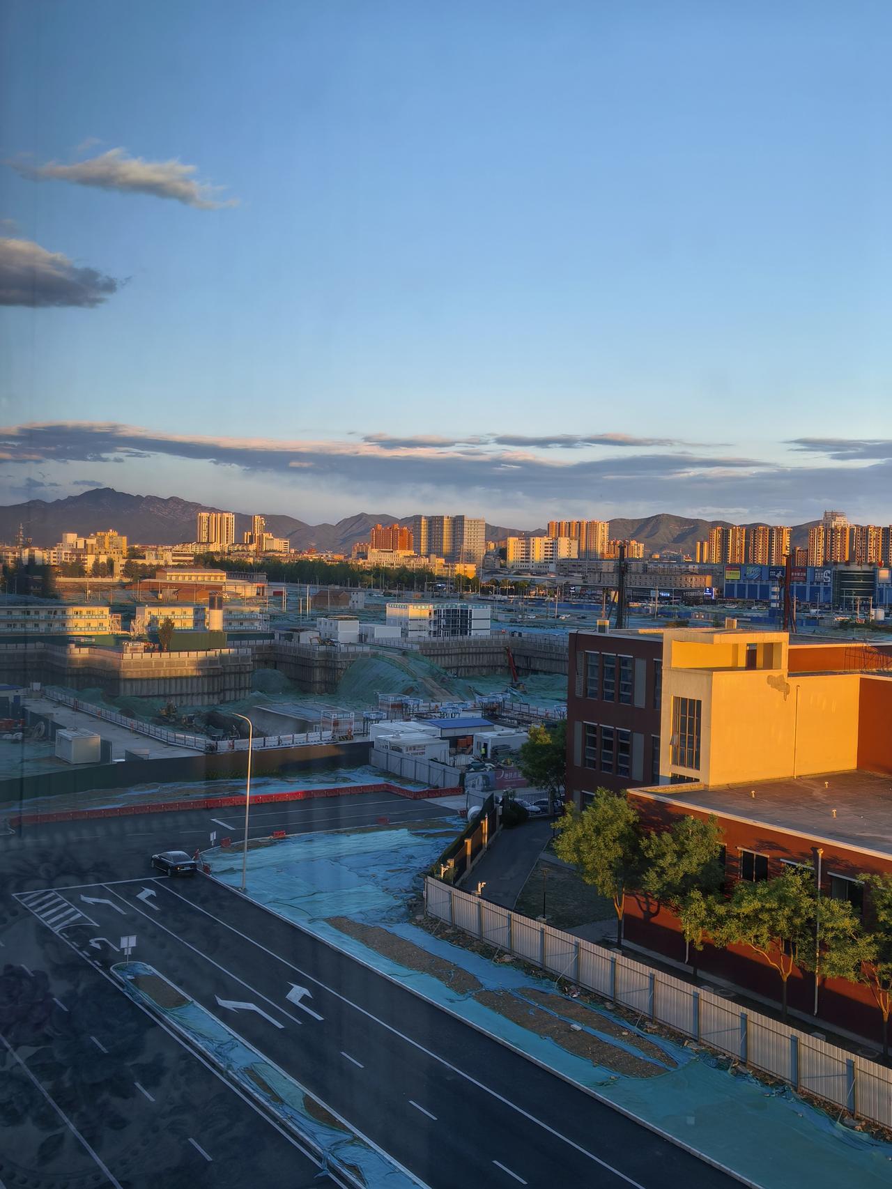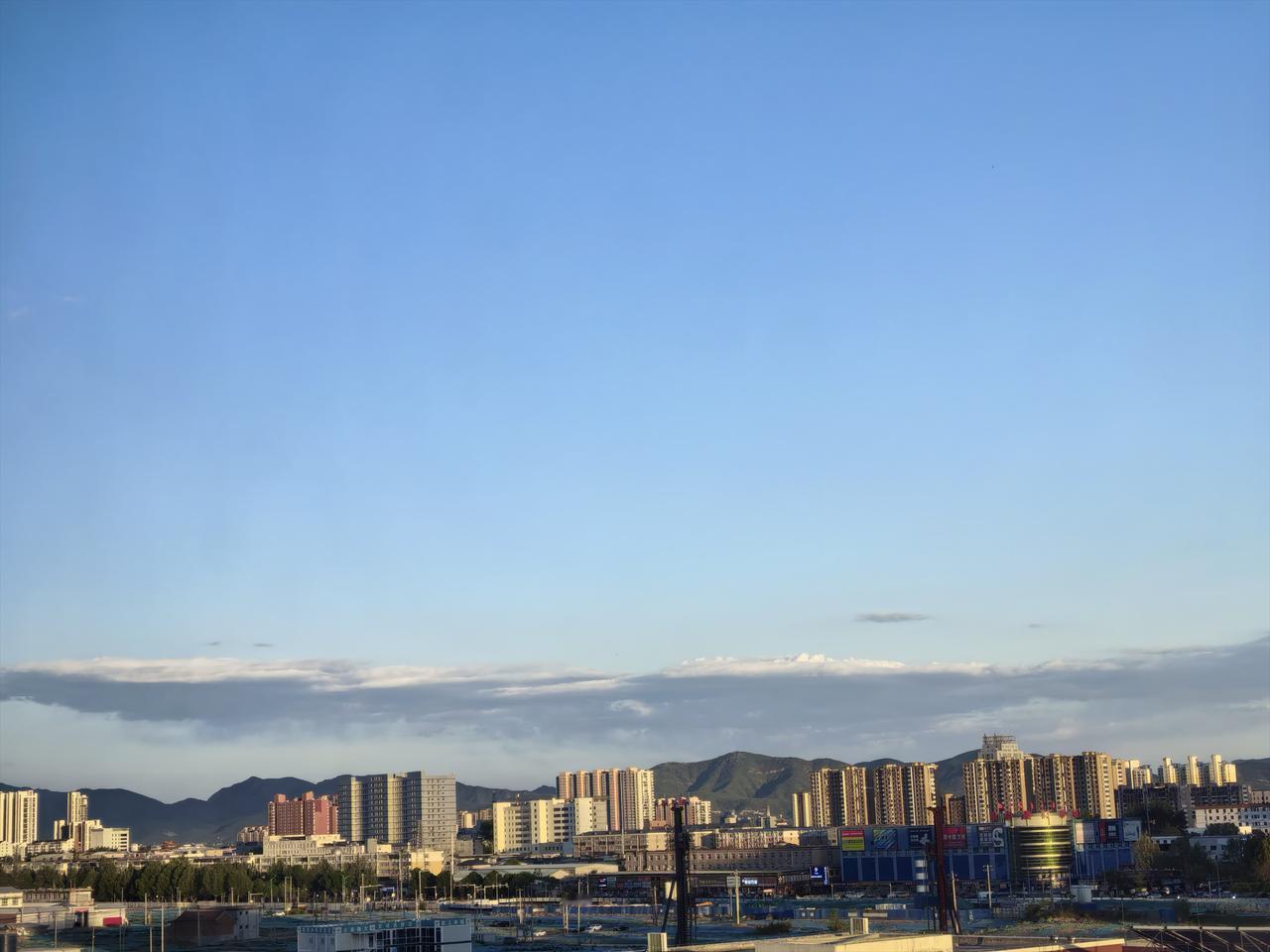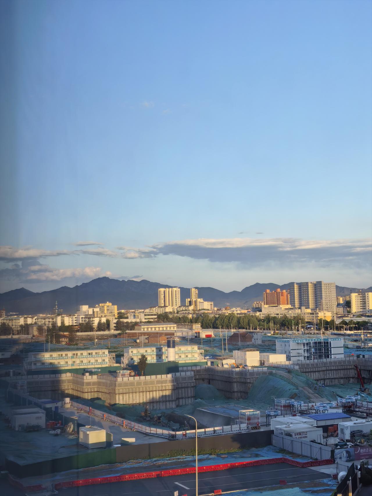 晚饭后当我站在窗前向外看的时候,哇!让我惊呆了,好久没有这么好天了,晚霞映照远处的盘山,近处的一幢撞楼房和学校教学楼以及正在施工的贾各庄回迁小区,新修的道路,蓝天漂浮着那层薄云,这画面太惬意了!蓝天白云下走走,心情都跟着敞亮了。