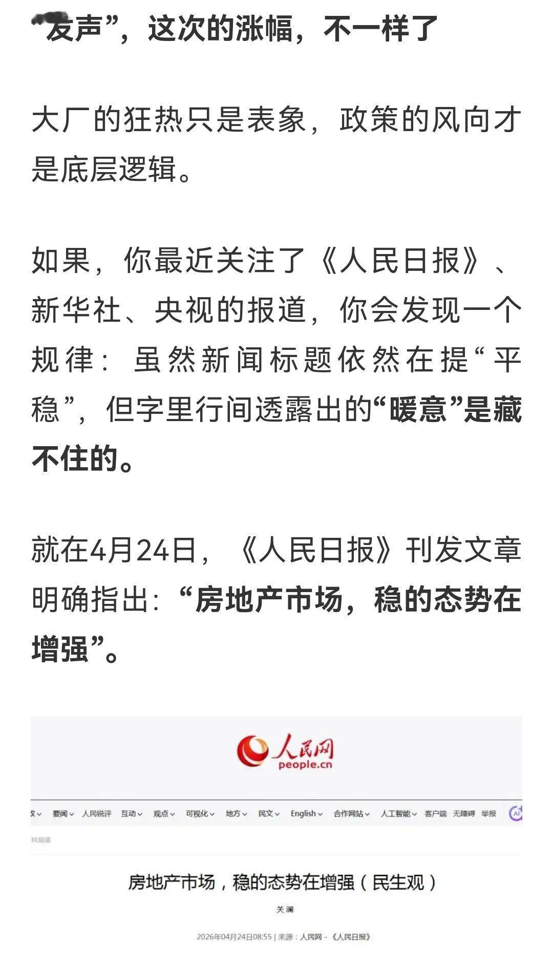 现在都是房价狂跌的声音,能听到为楼市唱多的声音难能可贵!支持房市稳定。房价再次回