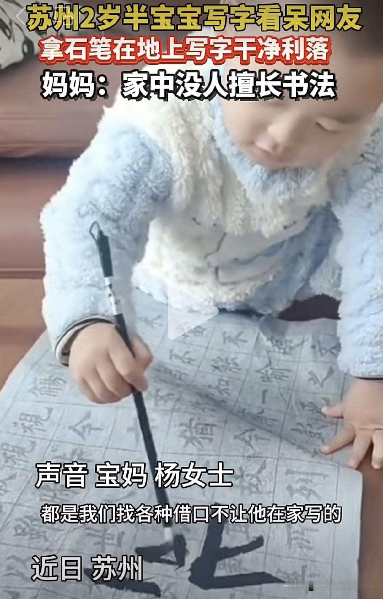 不用怀疑,这就是书法家带着记忆转世了。苏州一孩子才2岁,书法就已经非常了得。妈妈介绍,家里没有谁会书法,也没谁教过他。大概从一岁半开始,他就开始开挂了,拿起毛笔就开始写字,每天80%的时间都是沉迷在写字当中。就连出去玩的时间,都是爸妈担心他太过于用功影响身体,强行带出去玩的。