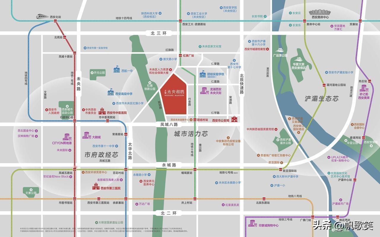 此外,项目北侧一路之隔是高新一中教育联合体:西安市团结实验学校,南侧约300米是地铁10号线团结村站,东侧下楼即达15.8万㎡的龙湖未央天街,西侧是红旗铁路公园。