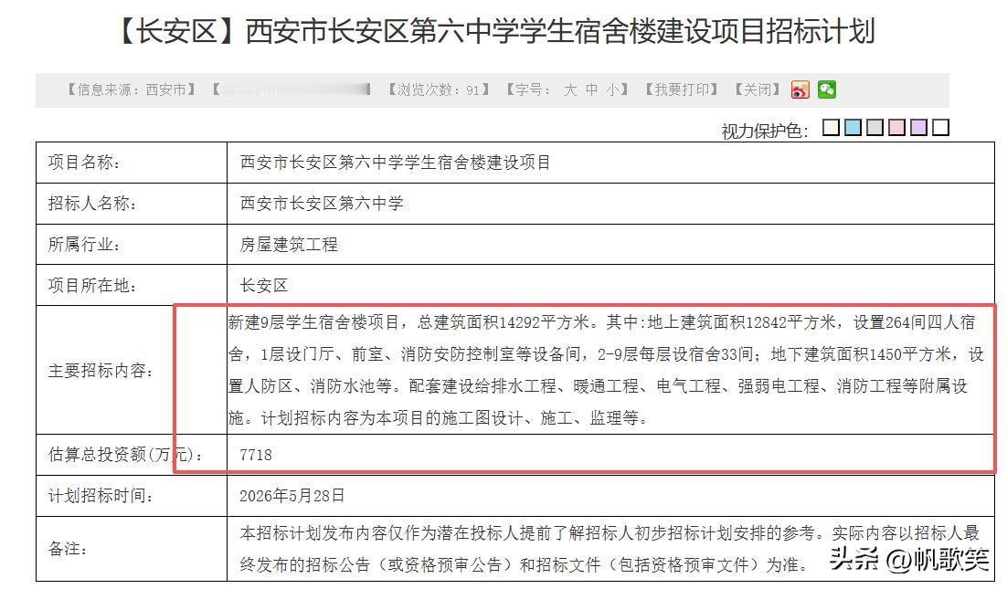 4 月 28 日,西安公共资源交易中心正式发布《【长安区】西安市长安区第六中学学生宿舍楼建设项目招标计划》,标志着这一关乎千名学子住宿品质提升的民生工程,正式进入落地倒计时阶段。