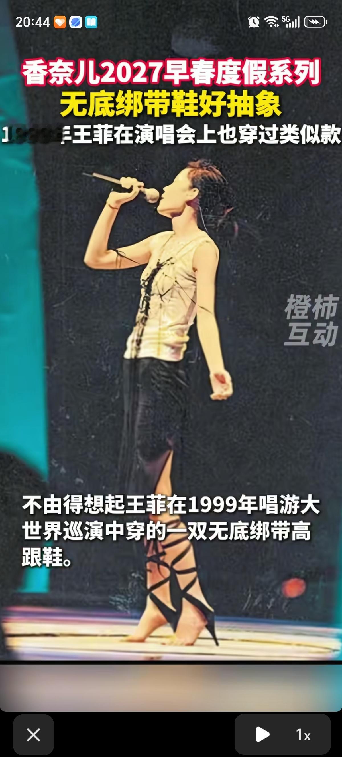 有趣的是,大家纷纷联想到1999年王菲“唱游大世界”演唱会的造型,她当时穿的一双黑色绑带无底高跟鞋,同样只有鞋跟、没有前掌鞋底,全靠绑带固定,在舞台上完成了唱跳表演,被视作华语乐坛的先锋时尚符号。