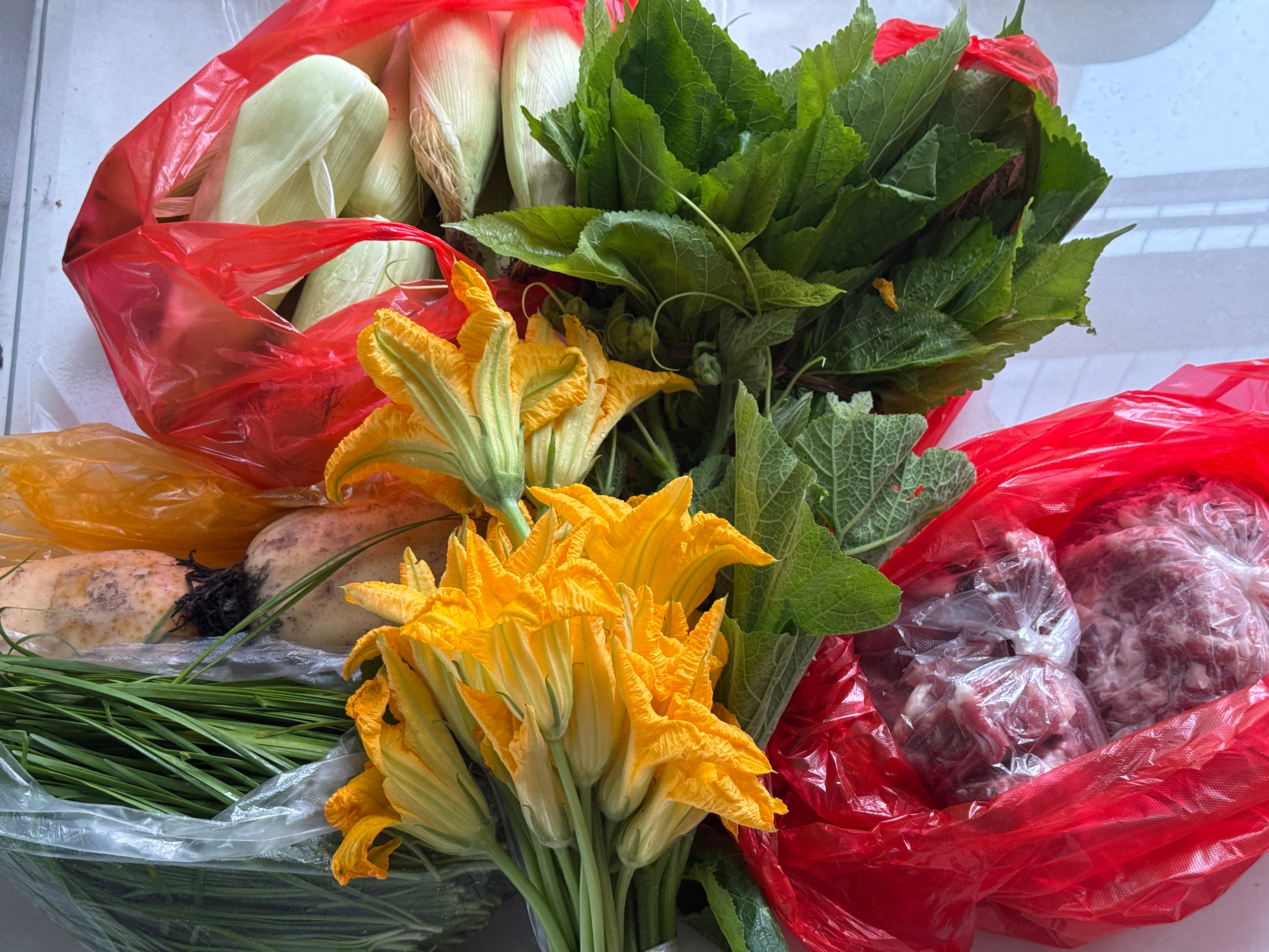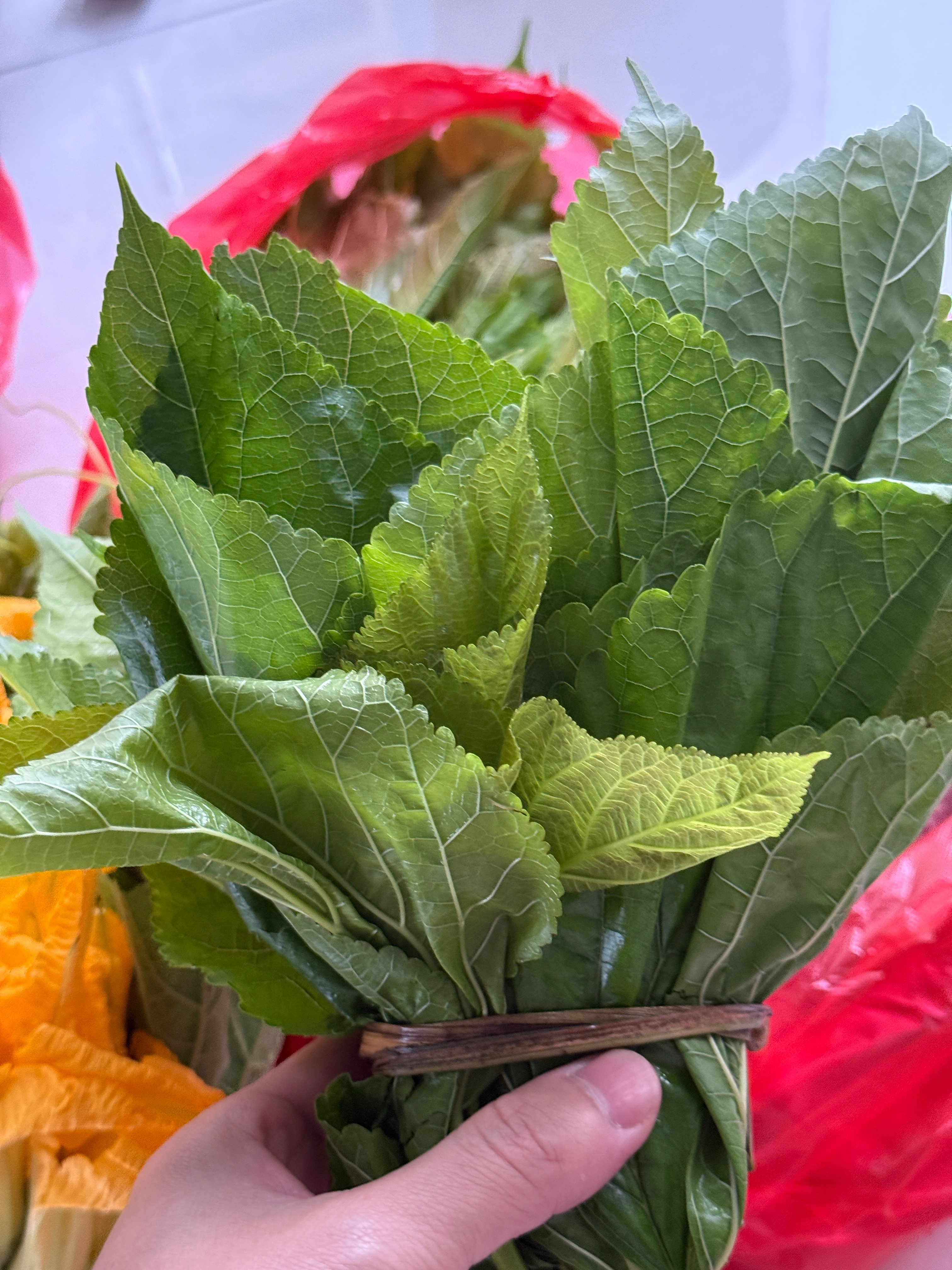 小学生还没上课的时候我已经买菜回来了全是农家菜南瓜花、南瓜苗、桑叶YYDS又吃上