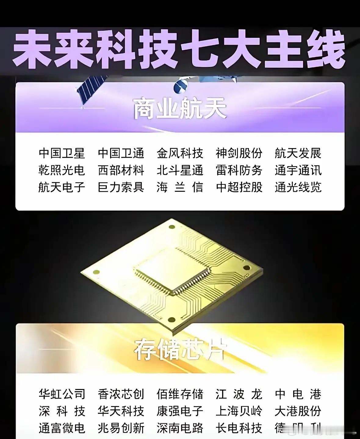 未来大科技板块及核心标的梳理:一、商业航天中国卫星、中国卫通、神剑股份、航天发展、航天电子、航发动力、巨力索具、西部材料、通宇通讯、北斗星通、通光线缆、海兰信、雷科防务、中超控股、天银机电、银河电子二、存储芯片香农芯创、兆易创新、江波龙、德明利、华虹公司、佰维存储、深科技、中电港、深南电路、上海贝岭、通富微电、康强电子
