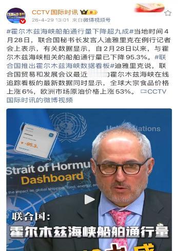 当地时间4月28日,联合国秘书长发言人迪雅里克在记者会上扔出一个重磅数据:自2月28日以来,霍尔木兹海峡相关船舶通行量直接暴跌95.3%,相当于100条船里只剩不到5条能过,这哪是通航,简直是名存实亡。