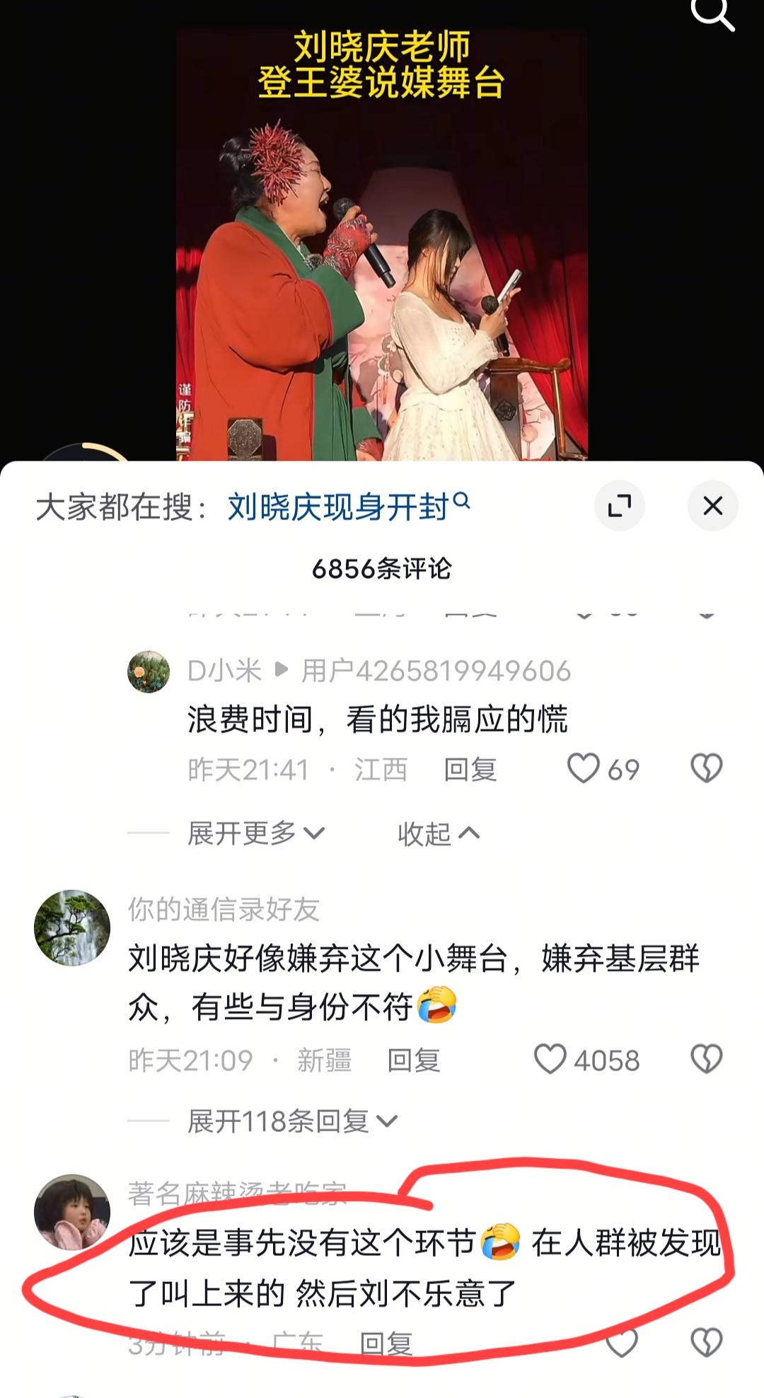 不过,也有网友表示:应该是事先没有这个环节,在人群被发现了叫上来的,有点“赶鸭子上架”味道,然后刘晓庆就不乐意了……