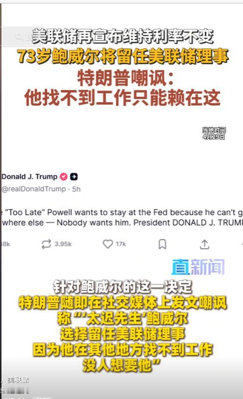 就在鲍威尔发布会结束后不到一小时,特朗普在自己的社交媒体平台 Truth Social 上发文,用他一贯的尖锐语气写道:"' 太迟先生 ' 鲍威尔选择留任美联储理事,因为他在其他地方找不到工作 —— 没人想要他。"