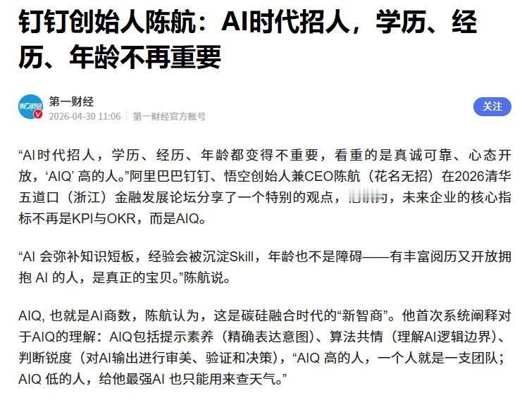 “AI时代招人,学历、经历、年龄都变得不重要,看重的是真诚可靠、心态开放,‘AIQ’ 高的人。”