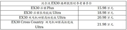 今日,豪华纯电SUV沃尔沃EX30焕新款正式上市,新车共推出四大版本,限时参考尊享价15.98万元—21.98万元*,同步推出多重限时大定权益,包括3年基础整车质保、免费三电系统8年16万公里质保、3年免费沃尔沃救援服务以及首任车主4年免费媒体数据流量权益。新车不仅以入门即豪华的硬核实力,配合诚意售价与限时权益,全面刷新豪华纯电小型SUV价值标杆,更凭借出众设计、可靠安全与高效三电实力,成为都市年轻精英、时尚家庭的高品质纯电出行优选。