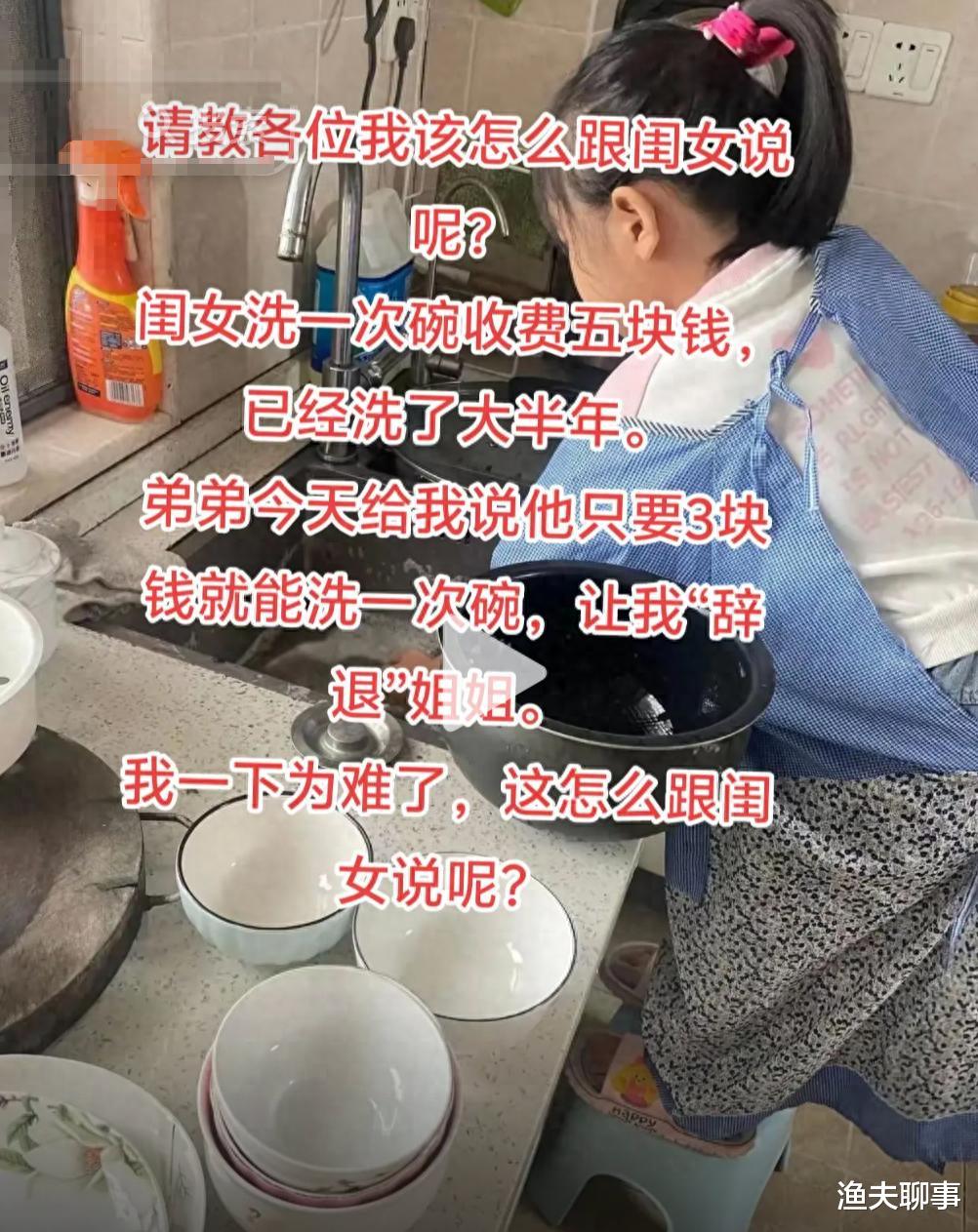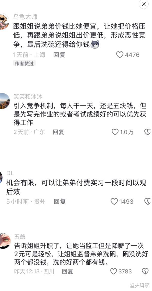 一位妈妈发文说,家里的洗碗工作一直是给姐姐(大女儿)的,5块钱一次,姐姐已经洗了大半年了,洗得也挺好的,但是最近儿子(弟弟)主动和她说,他也想要洗碗,只要3块钱一次。