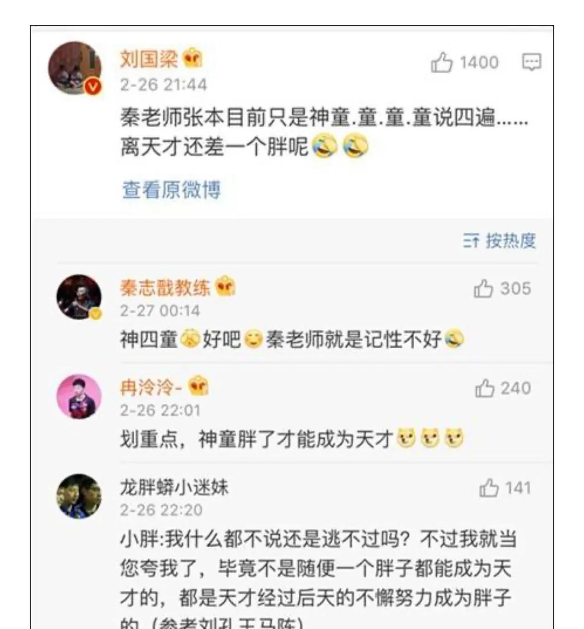 刘国梁这人,网上冲浪可厉害了。他看到媒体到处吹张本,就不高兴了。连秦志戬夸了张本一句,他都要跳出来制裁。刘国梁说,张本就是个神童,离天才还差得远呢。秦志戬听了赶紧改口,说自己记性不好。这场面,你说好笑不好笑?刘国梁这么做,一方面是为了稳定军心,另一方面也是在给张本施压。他知道,要是让张本太得意,对国乒可不是好事。但是刘国梁也不是完全不讲理,他还是承认张本在同龄人中确实厉害。你看,他说实话的时候,还是挺客观的。只是这话说完,他又赶紧补了一句,说中国还是统治级别的。这不就是典型的又打又拉吗?刘国梁这招真高明,既不否认事实,又不让人觉得他怕了张本。