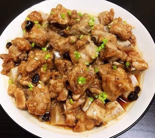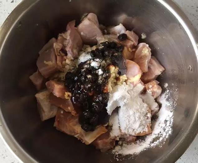 2、猪小排切成小块,先用淀粉搓干净,继续洗好后沥掉水分。把姜粒,生粉,豆豉放进去,再淋些生抽,盐,搅拌匀,腌一个钟头。