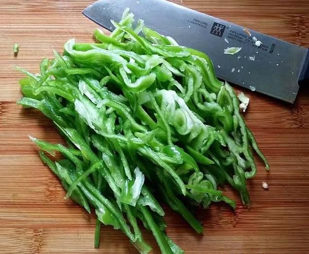 2、再来切一点青椒,同样也是切得越细越好,香味会更充分释放出来。