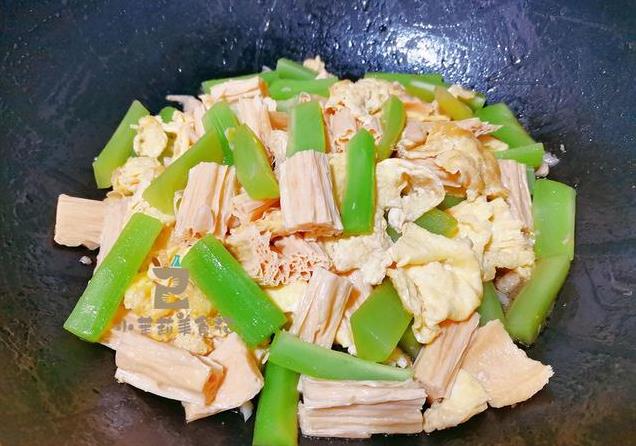 4、葱蒜要多放点,另外两样菜倒进去,仅需一点生抽和盐,快炒一分钟左右就熟透了,鸡蛋倒进去,再炒几下,马上盛出来。
