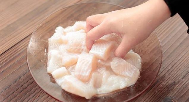 1、龙利鱼两片,充分解冻以后,片成块。加点白胡椒,生粉,抓匀之后待用。