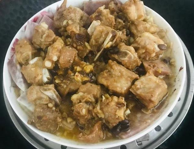 3、在盘底铺上芋头,把猪小排摆到里边,之后端入蒸锅,大火蒸一个钟头左右,直到熟透后关火出锅。