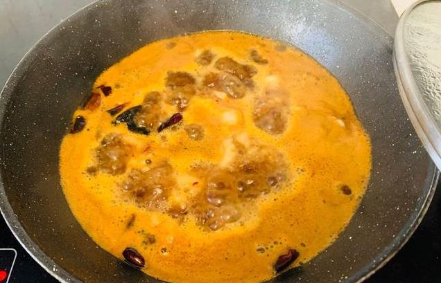 2、锅中放油,加一点豆瓣酱,葱姜干辣椒,香味被炒出来后,加入滚烫的热水,继续烧开。