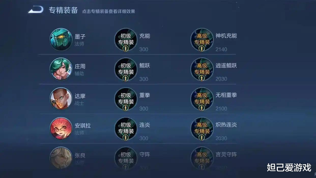 “达摩(击退增加)、张飞(二技能效果更改)、干将(大招复制二三技能)、大乔(全能,最初版本大招自带名刀)、项羽(12技能强化)”,这全都是专精装强度极高的英雄,特别是其中的干将和大乔更是逆天,前者制作专精装+圣杯后,几乎可以实现无限释放23技能,在当时,我一个不怎么会干将的玩家都能操作干将达到90%胜率,而后者大乔就更不用说了。