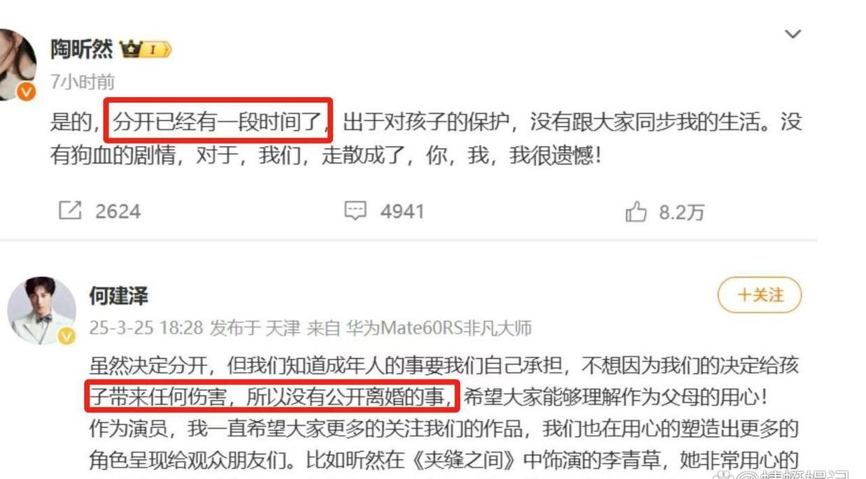 3 月 25 日,陶昕然在社交平台发文,确认自己已经离婚,并表示不存在那些狗血的情节,由此能够看出,他们二人只是和平分手。没过多久,男方何建泽也在社交平台发文做出回应,称之所以没有公开离婚,是怕会对孩子带来伤害。