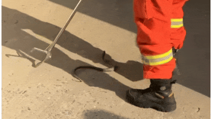 接到报警后,消防员10分钟内就赶到了现场,眼镜蛇还试图反抗,但被一名眼疾手快的队员用叉子直接挑起。