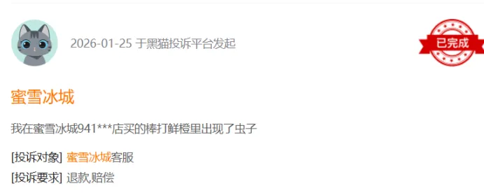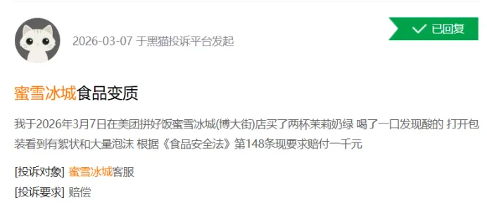 黑猫投诉平台的数据更是触目惊心,截至2026年3月13日,检索“蜜雪冰城”相关投诉累计达16673条;蜜雪冰城商家列表投诉量11110条,其中10943条已回复,9942条已完成。投诉内容涵盖饮品异物、食品变质、门店服务态度差等多重问题。