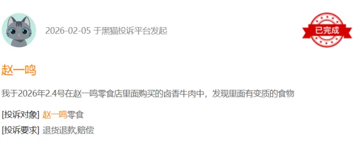 快速扩张的背后,是食品安全问题的隐忧。截至2026年3月13日,黑猫投诉平台检索“零食很忙”的投诉达795条,其中已完成758条;“赵一鸣”的投诉则达2252条,核心问题包括食品变质、临期过期、内有异物等,反映出品牌在并购整合过程中,品控标准未能实现有效统一。