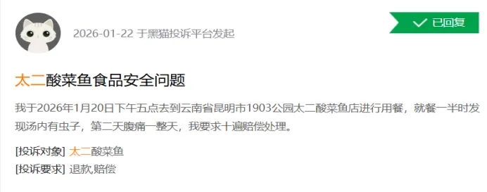 截至2026年3月13日,黑猫投诉平台数据显示,检索“太二酸菜鱼”投诉151条,其中141条已回复,113条已完成;检索“太二”相关投诉318条;检索“怂火锅”(九毛九集团旗下另一品牌)相关投诉21条,核心集中于餐食异物、外卖争议等问题。