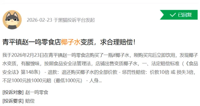 截至2026年3月13日,黑猫投诉平台检索“if椰子水”相关投诉1369条,集中于“口感异常”“保质期内变质”等问题。需说明的是,该关键词投诉未明确限定品牌归属,部分投诉可能涉及名称相近的同类椰子水产品,并非全部指向IFBH旗下椰子水。