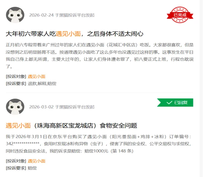 遇见小面的食品安全问题早已埋下隐患,2024年6月,遇见小面因食品安全问题被北京市海淀区市场监督管理局点名并责令整改;同年11月,其东直门分公司又因“经营场所环境不洁”遭警告处罚。截至2026年3月13日,在黑猫平台106条投诉搜索中,卫生质量问题占比超60%。