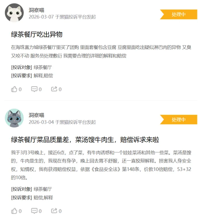 但高速扩张背后,品控短板逐渐暴露。黑猫投诉平台检索“绿茶餐厅”相关投诉达301条,问题集中于餐食异物、食材变质、品控不稳定等。