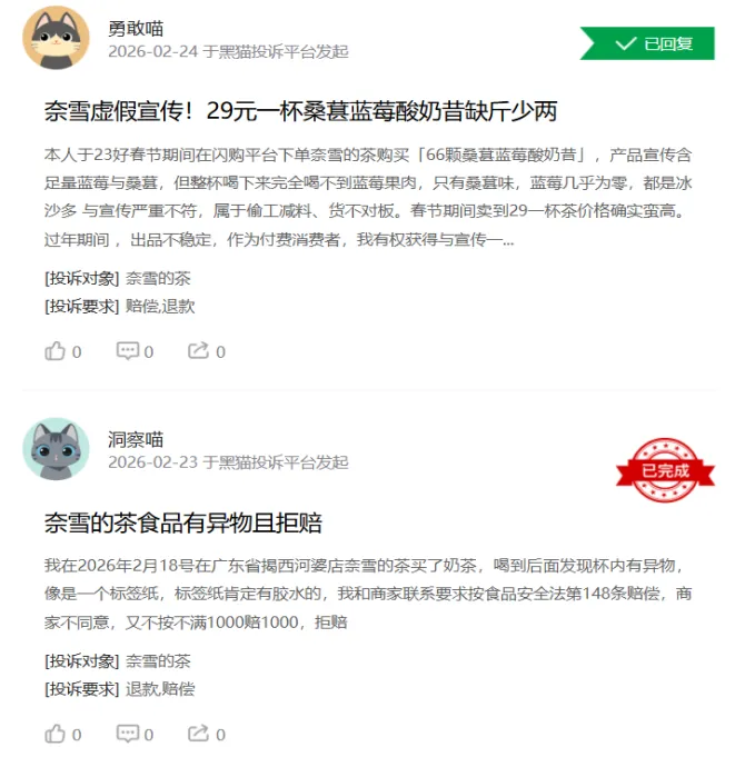 截至2026年3月13日,黑猫投诉平台检索“奈雪的茶”相关投诉达2145条,主要集中于奶茶内有异物、食品变质、门店服务态度差等问题。
