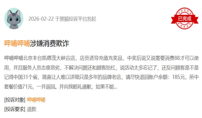 消费者投诉数据显示,截至2026年3月13日,黑猫平台关于呷哺呷哺的投诉851条,除食品安全问题外,“畅吃卡规则复杂”“服务员误导消费”等营销套路投诉占比达32%,网友调侃“好歹毒的会员卡,故意把规则搞得很复杂,服务员也说得不清不楚”,这种与“真诚才是必杀技”行业共识相悖的营销方式,进一步透支了品牌信誉。