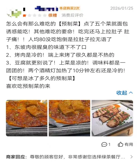 同时,《港湾商业观察》注意到,在大众点评平台检索“绿茶餐厅”,其门店评分大多处于3.8-4.3分区间;翻阅消费者评论可见,差评集中指向菜品口味下滑、服务体验不佳、预制食材经加热后仍未熟透等问题。
