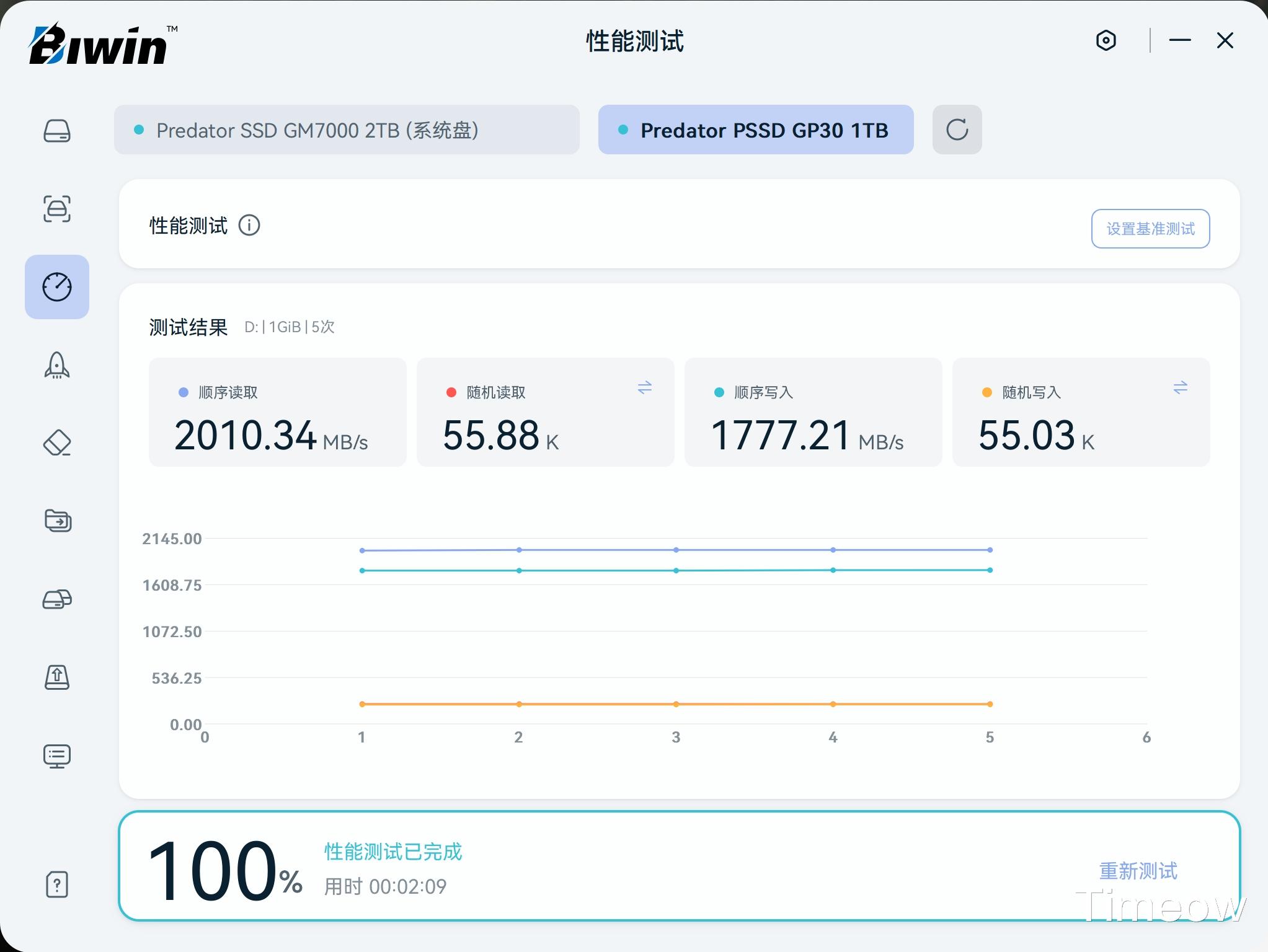 其内置测速工具相当于把CrystalDiskMark内嵌了进去,相比CrystalDiskMark它可以显示每轮测试的数据对比,还挺好使。