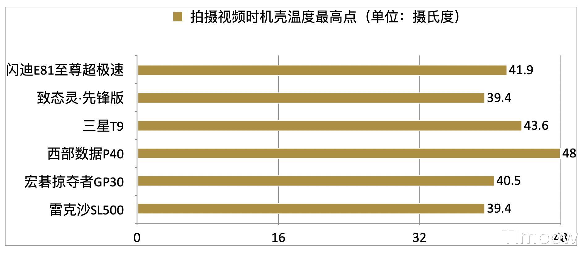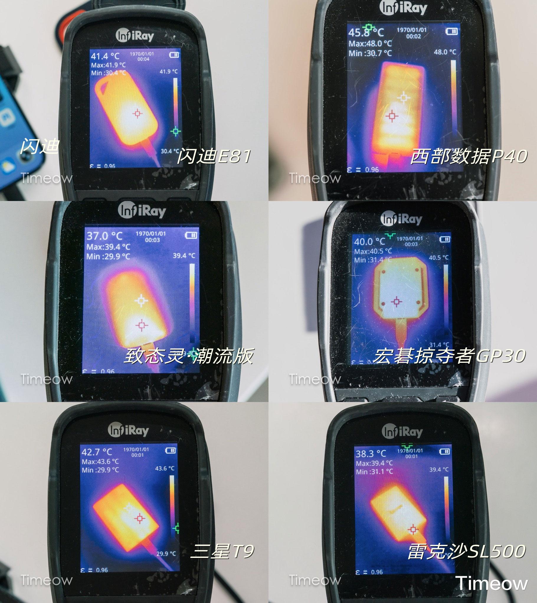 其中西部数据P40的表面温度最高,最高(图中Max后面的温度,后同)达到了48摄氏度;其余五款的发热和散热都控制的不错,尤其是致态灵·潮流版和雷克沙SL500,最高温在40摄氏度以下,温度控制的不错,在拍摄使用时握在手里会更舒服一些。