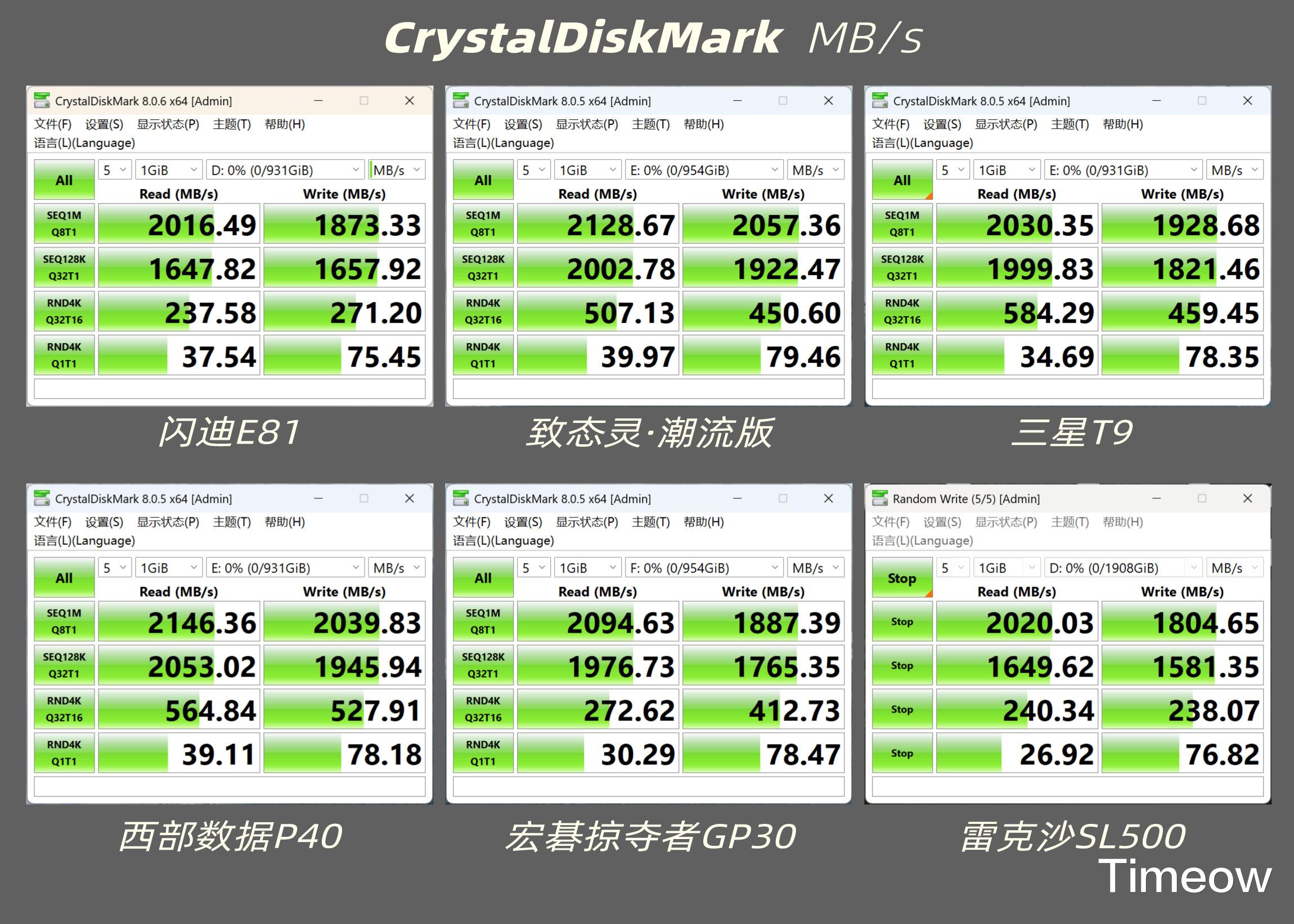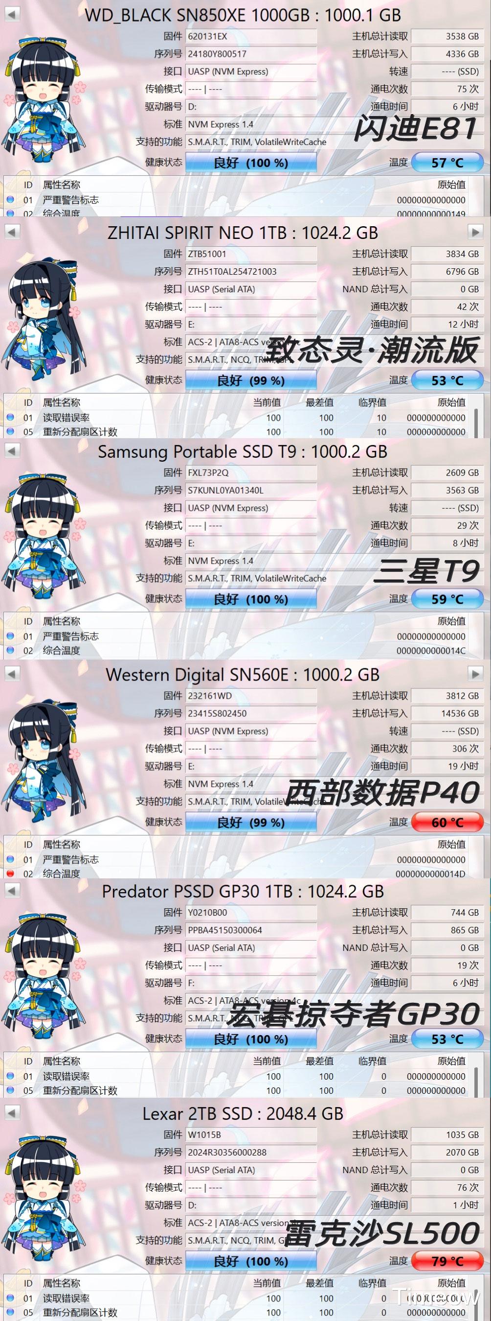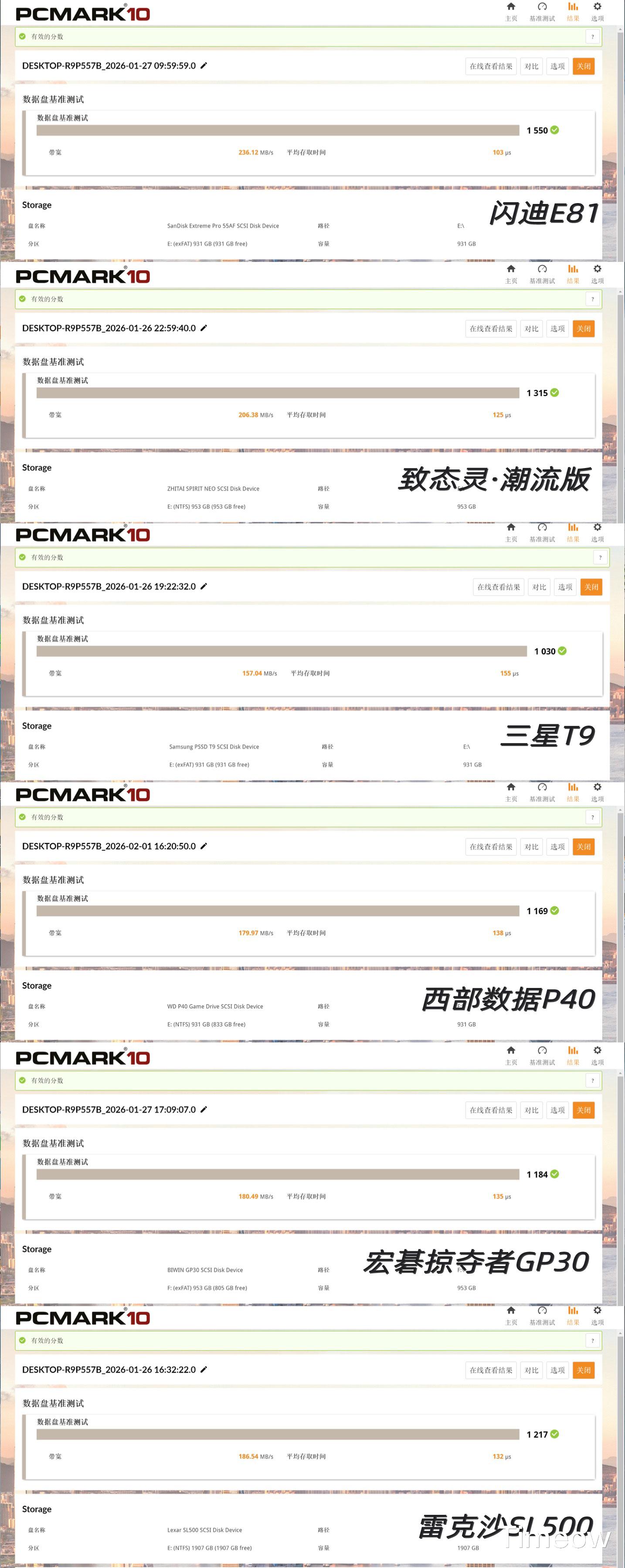 以上分别为闪迪E81至尊超极速(简称闪迪E81)、致态灵·潮流版、三星T9、西部数据P40、宏碁掠夺者GP30、雷克沙SL500。