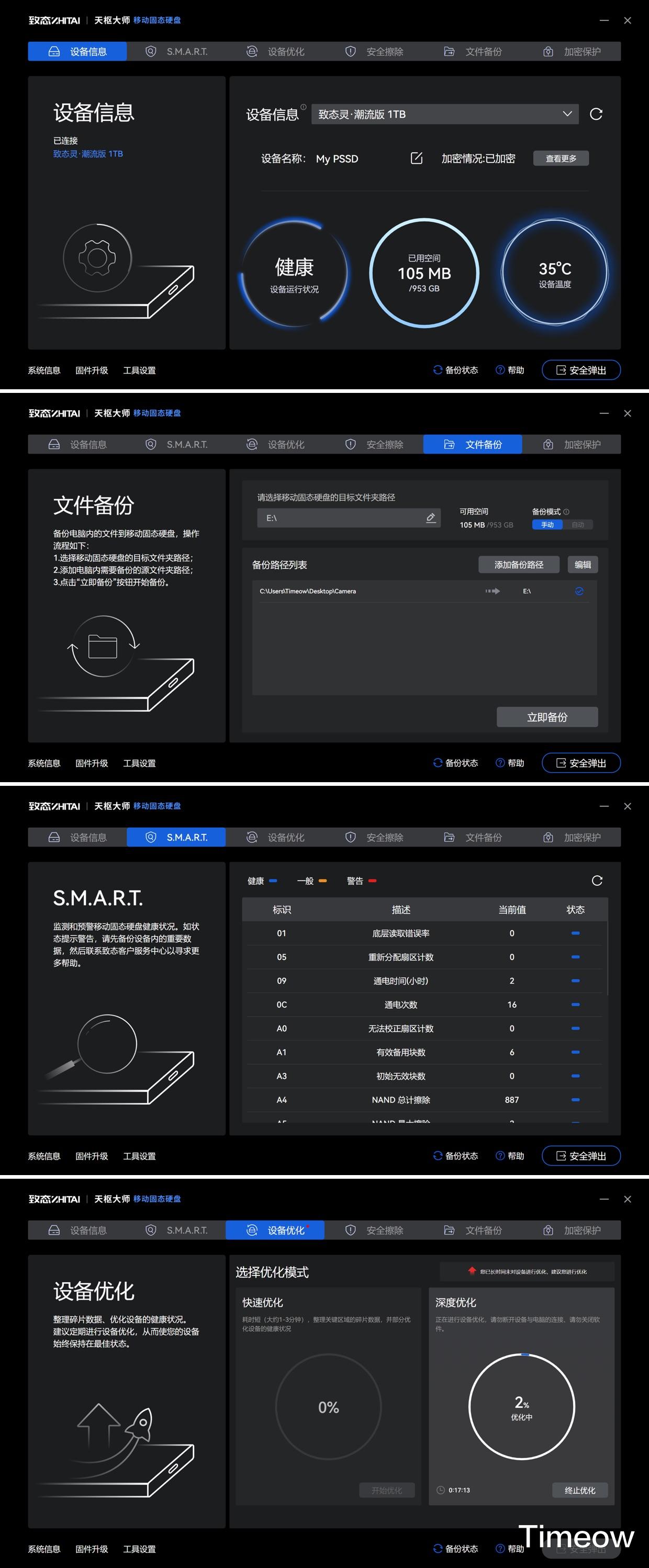 致态天枢大师移动固态硬盘管理软件是一个一站式PSSD管理软件,除了能自动备份电脑文件、更新固件等常规功能外,还可以查看致态灵系列PSSD的健康度和工作状态、进行设备优化。